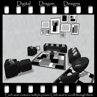 Yay!!! New Furniture! Ninja went ahead and released a few more living room sets. Remember everything can be purchased either seperately or as a full set so its all mix and match. Furniture contains sculpted pieces and is relatively low prim. Also every seat contains multiple poses in it. Its a touch script so you just touch the seat and it will change the pose for you.